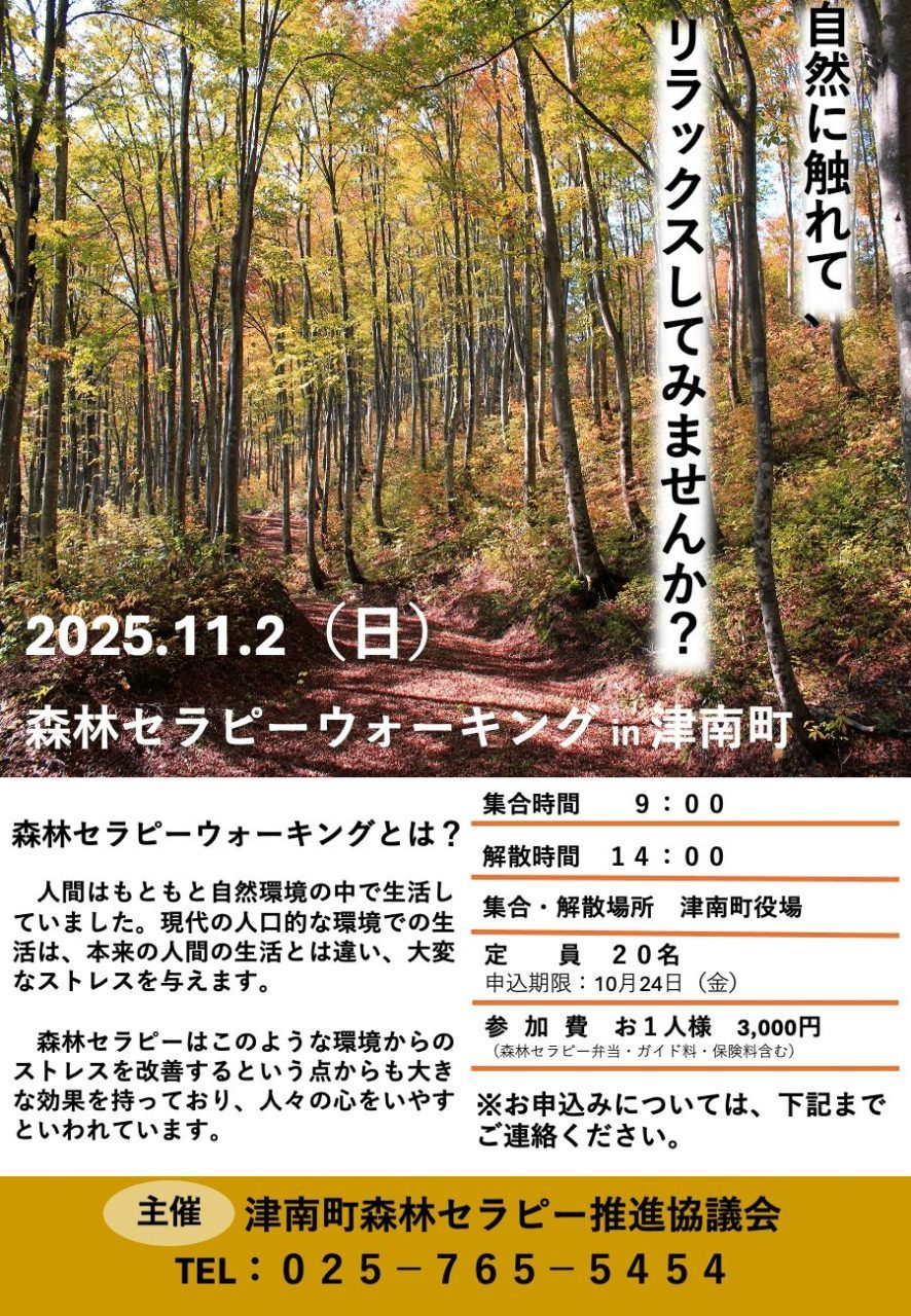 - 津南町森林セラピー推進協議会 事務局 (津南町役場 観光地域づくり課内) TEL:025-765-5454 FAX:025-765-4625 E-mail:chiiki@town.tsunan.niigata.jp